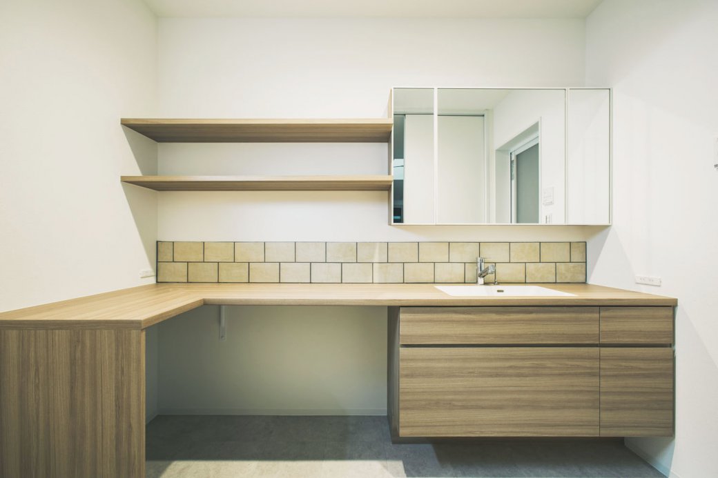 洗面室に家事スペースを設け、家事動線がスムーズに。 2人並んでも十分な広さで、朝の準備から洗濯まで快適に過ごせる工夫が 施されています。 また、脱衣室は別に設けることで、プライバシーと機能性を両立。 整理整頓や家事効率を高める空間設計です。